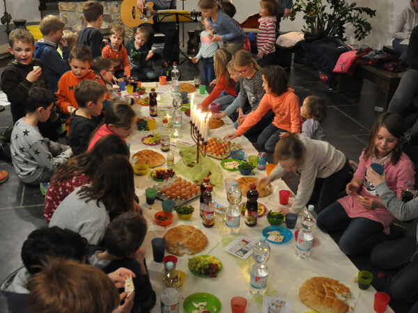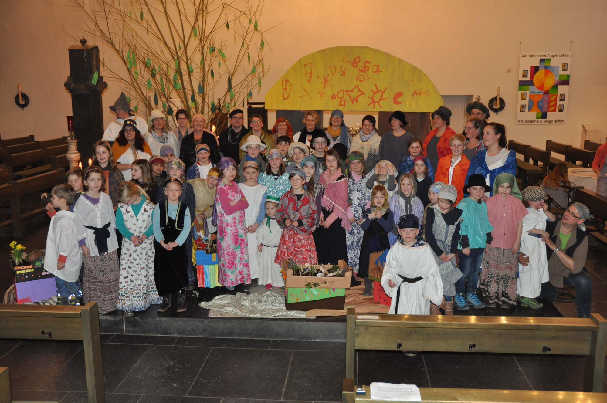 Nicht nur die an den Familienprojekttagen teilnehmenden Mädchen und Jungen, Eltern und Freunde in ihren bunten Kostümen und Gewändern aus der Zeit Jesu waren begeistert - auch zahlreiche Zuschauer, die sich am Ende des Wochenendes noch zusätzlich in der Pfarrkirche Bruchhausen eingefunden hatten, klatschten lange Beifall. Weit über 60 Kinder und Erwachsene hatten nämlich innerhalb der beiden vorangegangenen Tagen in spannenden Erzählungen viel über das wirklich aufregende Leben von Jesus von Nazareth erfahren und diese Geschichten und die damit verbundenen Lebensstationen sowohl musikalisch als auch gestalterisch akribisch und sehr kreativ umgesetzt. Begebenheiten aus dem Leben Jesu und vor allem die wichtigsten Stationen aus der Passionsgeschichte wurden von allen Beteiligten packend inszeniert. Dafür wurden Kulissen gebaut, Lieder gesungen, die Geschichten aus Jesu Leben unter anderem in einen Tanz und in ein Hörspiel umgesetzt und als ein Höhepunkt am Freitagabend gemeinsam mit der ganzen Gruppe ein Pessach-Fest, wie es auch Jesus mit seinen Freunden erlebt haben könnte, gefeiert.