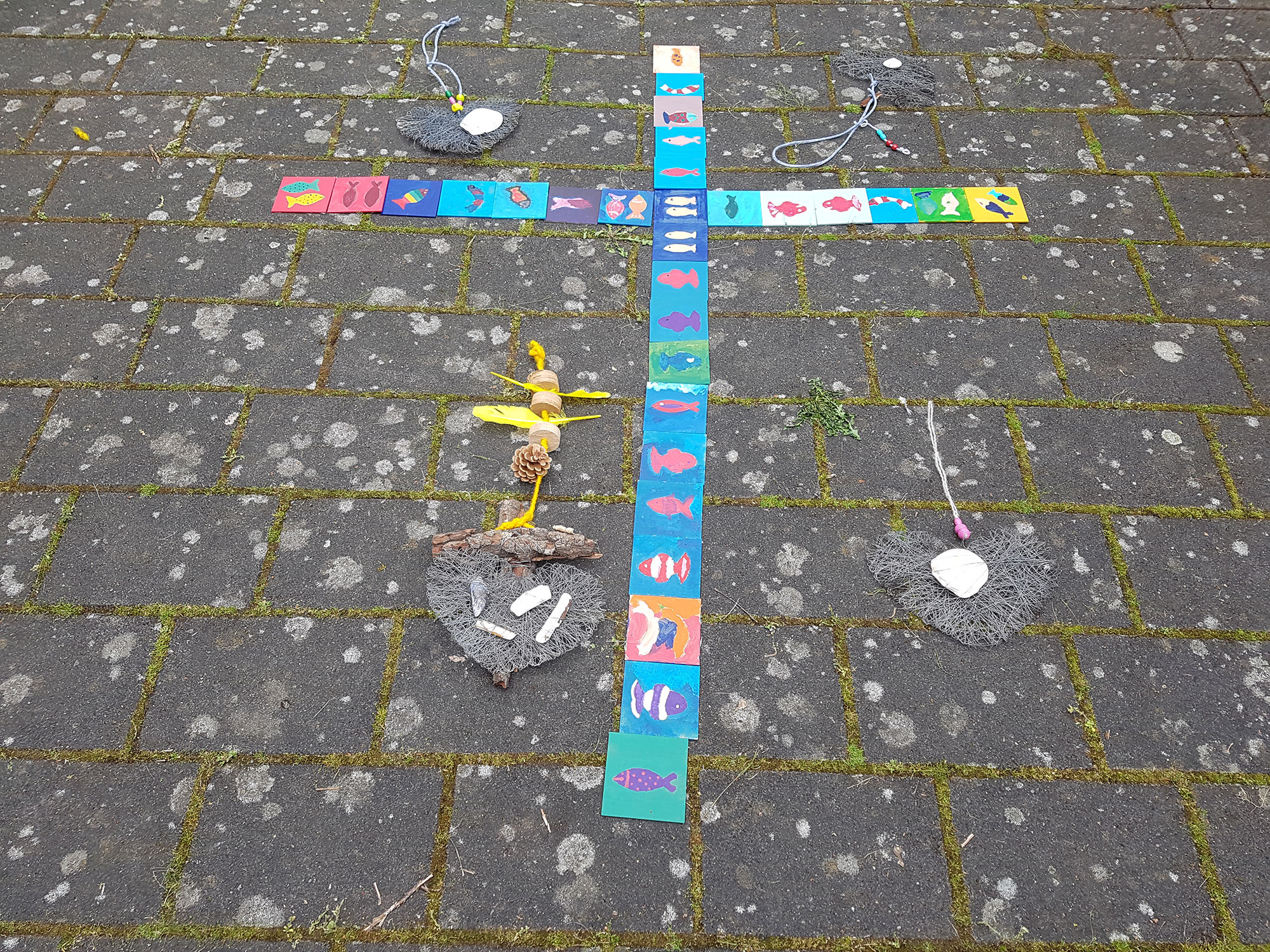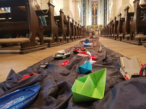 Großes Interesse, in einem angemessenen Rahmen gemeinsam mit der Familie dieses Wochenende vor Ort als einen Baustein der Vorbereitung auf die Erstkommunion zu erleben, war durchgängig bei allen Teilnehmenden spürbar. Die Angebote und Aktionen am Samstag in allen beteiligten Gemeindezentren waren ebenfalls vom schon erwähnten Motto kreativ inspiriert und wurden in vielen sehr kleinen Gruppen hintereinander in den Gemeinden St. Martin, St. Elisabeth, St. Bonifatius und St. Nikolai bunt und sehr persönlich umgesetzt. Dann und wann gehörte auch eine Portion „Vertrauen“ und Mut dazu: Sowohl beim Balancieren auf der Slak-Line oder während einer Fahrt in einer Schubkarre über ein Seil wurde vertrauensvolle Unterstützung gebraucht. Auch ein „brennendes Herz“ als Symbol für Liebe und Vertrauen innerhalb der eigenen Familie selber anzufertigen und individuell zu dekorieren oder aus vielen kleinen selbstgemalten Kacheln ein großes buntes Kreuz gemeinsam zu legen, erforderte das gemeinsame Anpacken aller Familienmitglieder, die mitgekommen waren. Sogar eine Bootsflotte wurde auf der Lippe zu Wasser gelassen – als Anklang an die zentrale biblische Geschichte des Wochenendes, die davon erzählte, dass Petrus, einer der Jünger Jesu, während eines Sturmes aus seinem Fischerboot stieg, als er Jesus erkannte und seinem Meister quer über einen aufgewühlten See übers Wasser entgegen ging… solange, bis ihm Zweifel an seinem eigenen Tun kamen. Mit seinem Zweifel drohte er unterzugehen, doch Jesus half ihm wieder zurück ins Boot und machte ihm klar: „Vertrau mir, ich bin da!“